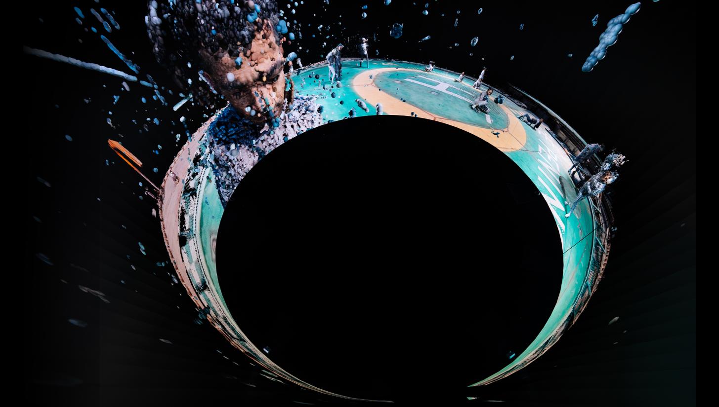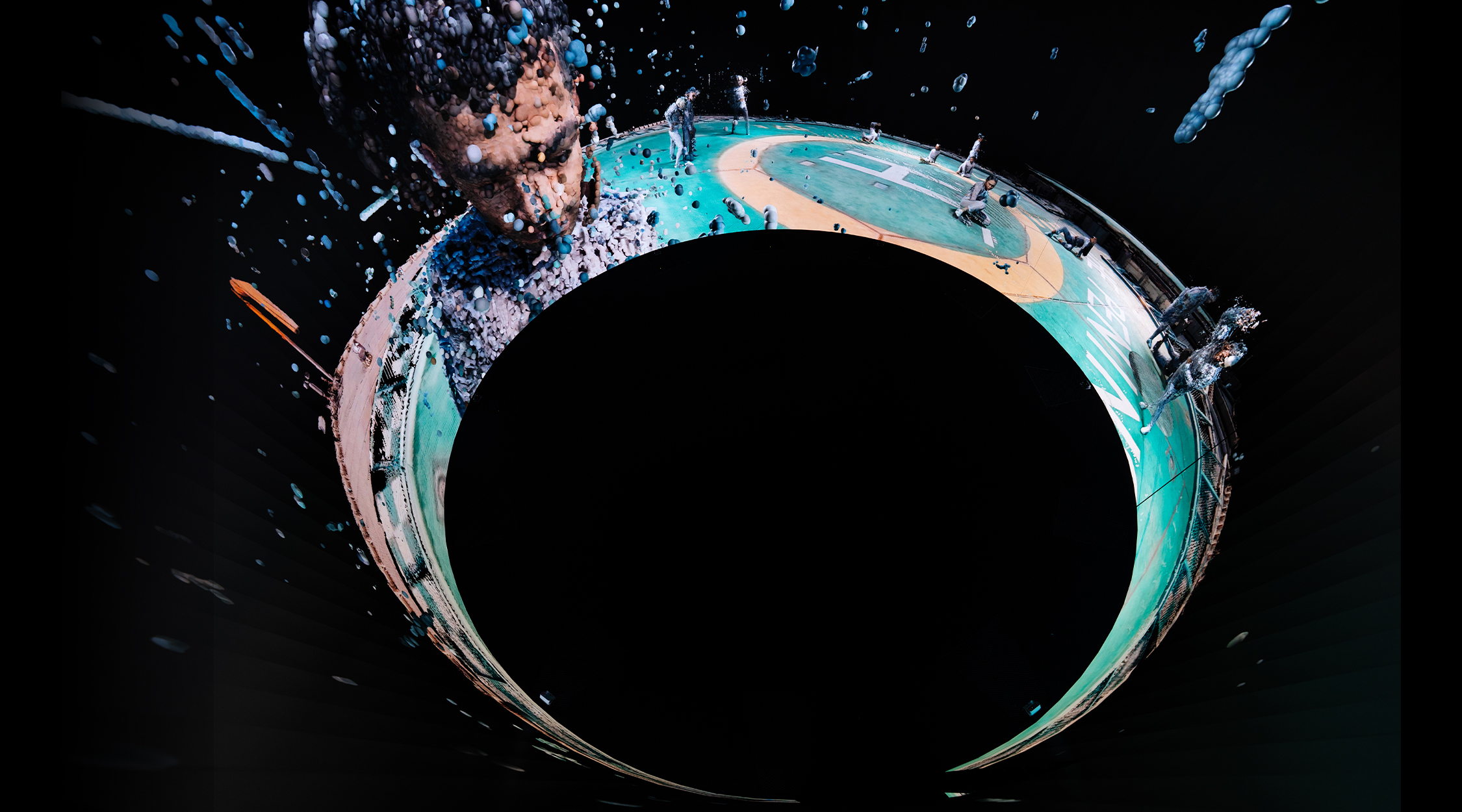 Leveraging the interaction paradigms of Jeffrey Shaw’s pioneering media art practice, On The Other Earth takes place within Shaw’s radically immersive nVis installation space - the world’s first 360-degree stereoscopic LED cinematic screen, its 26-million-pixel panoramic 3D imagery experienced inside an enveloping cylindrical architecture of eight metres wide and four metres tall.